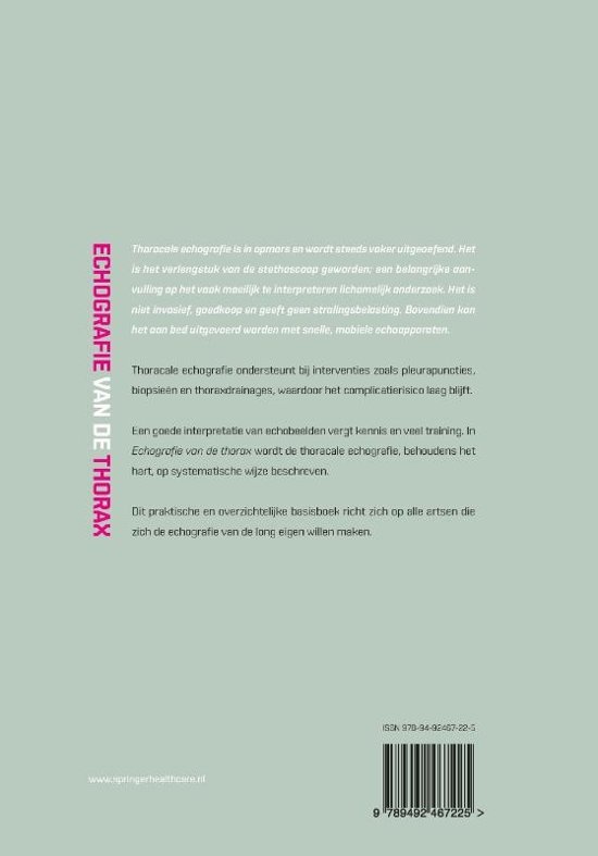 Een goede interpretatie van echobeelden vergt kennis en veel training. In Echografie voor de thorax wordt de thoracale echografie, behoudens het hart, op systematisch wijze beschreven.