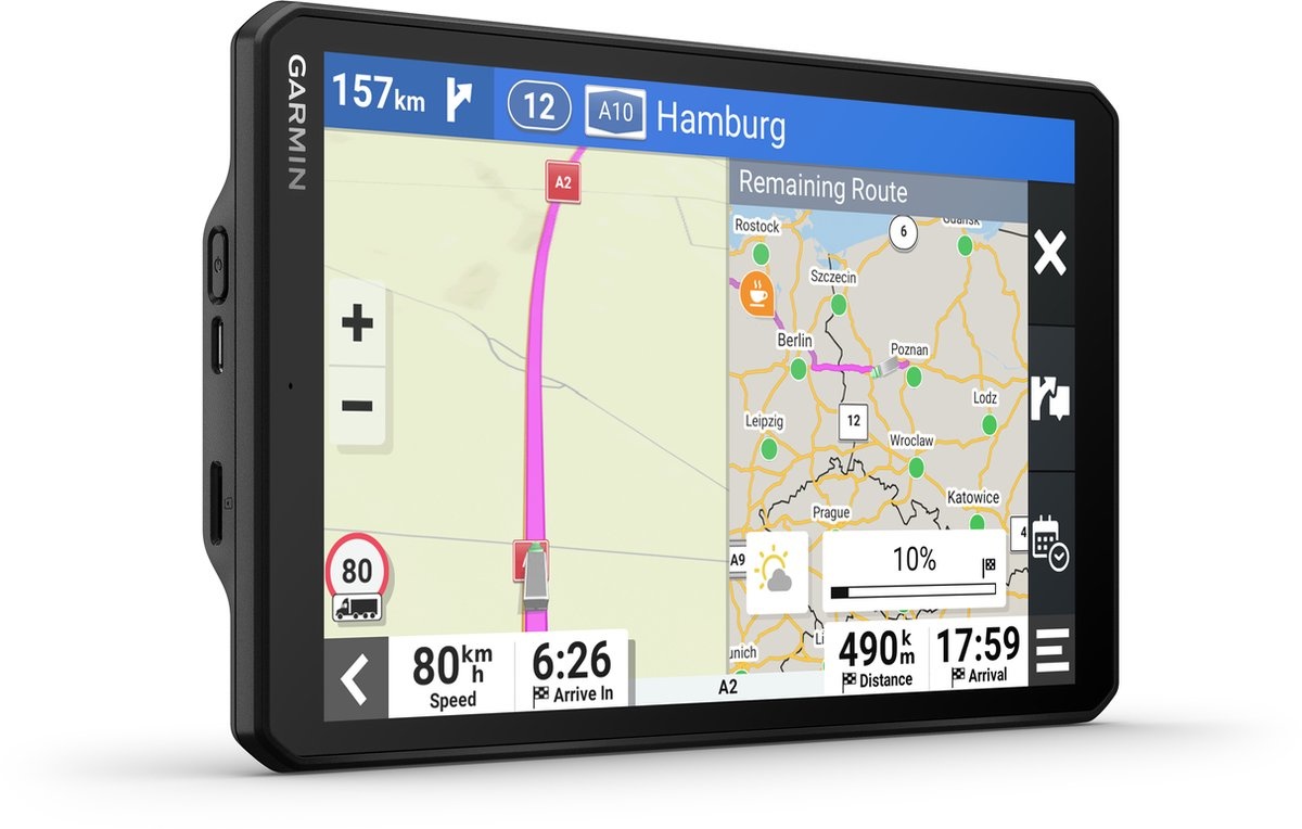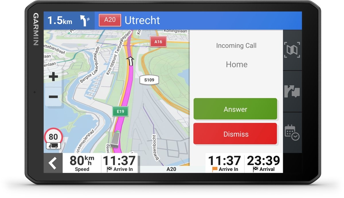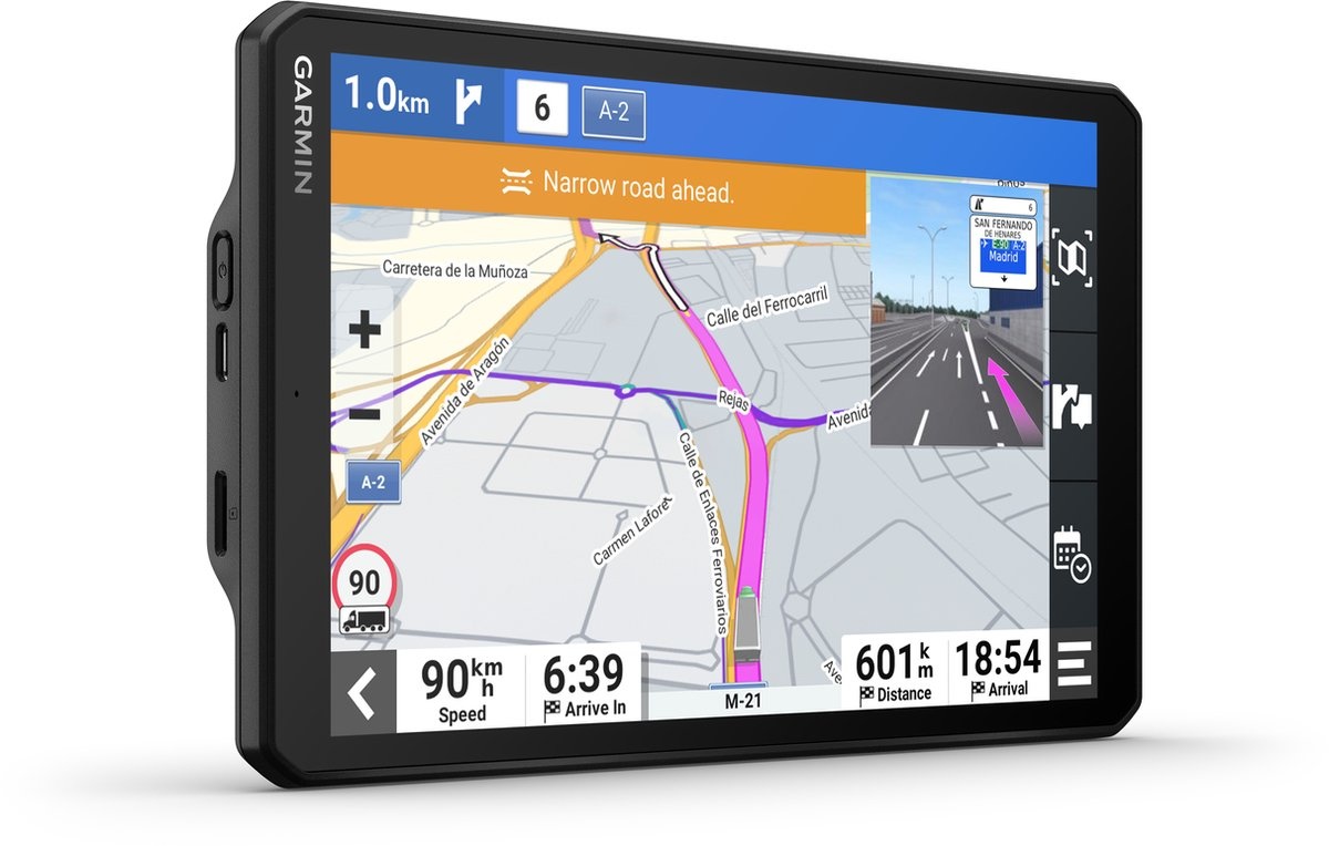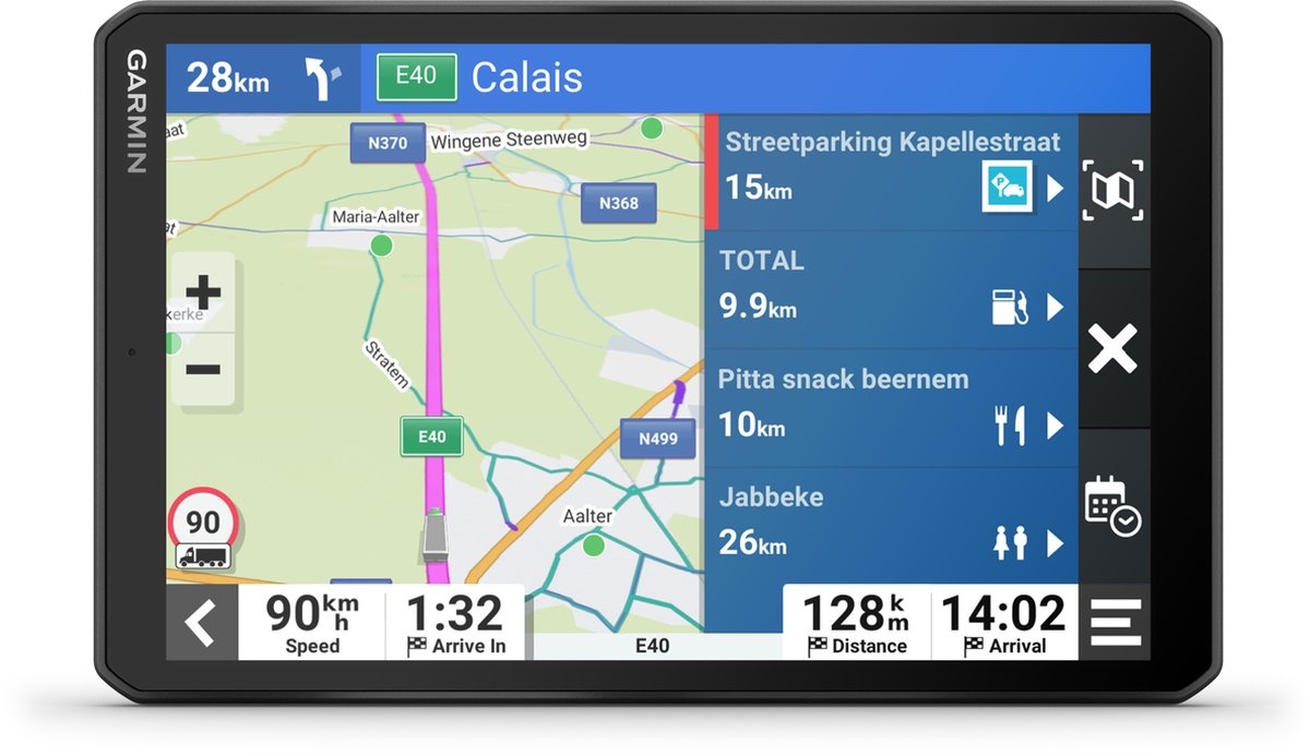 Je houdt goed zicht op de weg dankzij het gemakkelijk afleesbare navigatietoestel van 8 inch met speciale vrachtwagenroutes die passen bij de lengte, het gewicht en zelfs de lading van jouw truck. De route vermijd waar nodig scherpe bochten, lage viaducten, wegen met een gewichtbeperking of stijle hellingen.