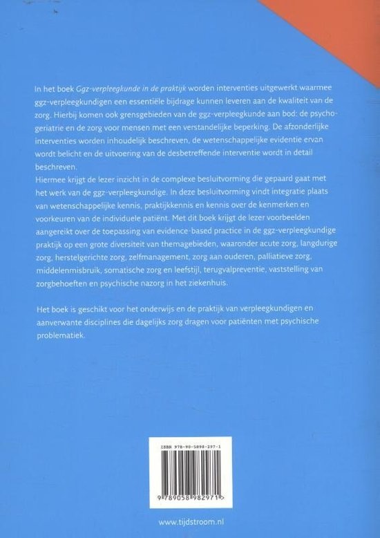 In het boek krijgt de lezer inzicht in de complexe besluitvorming die gepaard gaat met het werk van de ggz-verpleegkundige. In deze besluitvorming vindt integratie plaats van wetenschappelijke kennis, praktijkkennis en kennis over de kenmerken en voorkeuren van de individuele patiënt. Met dit boek krijgt de lezer voorbeelden aangereikt over de toepassing van evidence-based practice in de ggz-verpleegkundige praktijk op een grote diversiteit van themagebieden, waaronder acute zorg, langdurige zorg, herstelgerichte zorg, zelfmanagement, zorg aan ouderen, palliatieve zorg, middelenmisbruik, somatische zorg en leefstijl, terugvalpreventie, vaststelling van zorgbehoeften en psychische nazorg in het ziekenhuis.