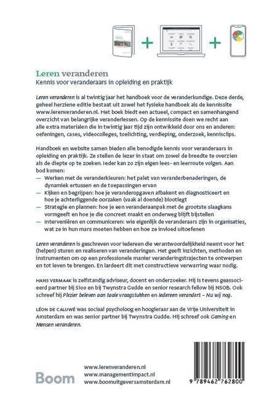 Het boek biedt een actueel, compact en samenhangend overzicht van belangrijke veranderlessen. Op de kennissite doen we recht aan alle extra materialen die in twintig jaar tijd zijn ontwikkeld door ons en anderen: oefeningen, cases, videocolleges, toelichting, verdieping, onderzoek, kennisclips.
