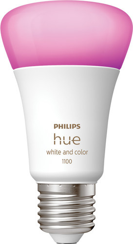 De Philips Hue White & Color E27 1100lm is een losse smart lamp die licht geeft in alle kleuren van de regenboog én meerdere tinten wit licht. Zo zorg je altijd voor de juiste sfeer in huis. Je kiest voor warm licht als je wilt relaxen, fel licht om je te concentreren en vrolijke kleurtjes tijdens een feestje. Deze lamp heeft een vermogen van 10.5 watt. Dat komt overeen met een ouderwetse gloeilamp van 100 watt. Zo zorg je voor verlichting in een gemiddeld grote kamer. Te fel? Dan pas je de lichtsterkte eenvoudig aan in de app. Je koppelt deze lampen via bluetooth direct aan je telefoon. Zo ga je direct aan de slag. Wil je meer dan 10 lampen in huis bedienen of extra opties zoals timers instellen of je smart lampen via internet bedienen? Dan koppel je de lampen eenvoudig met een Hue Bridge.